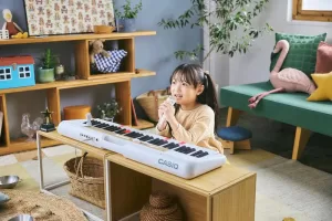 LK-340は、童謡や人気アニメ主題歌が内蔵曲として入っており、デザインもブラウンのチェックのワンポイントで可愛らしいので、特にピアノを始めようかな?と考えられているお子様へおすすめ✨