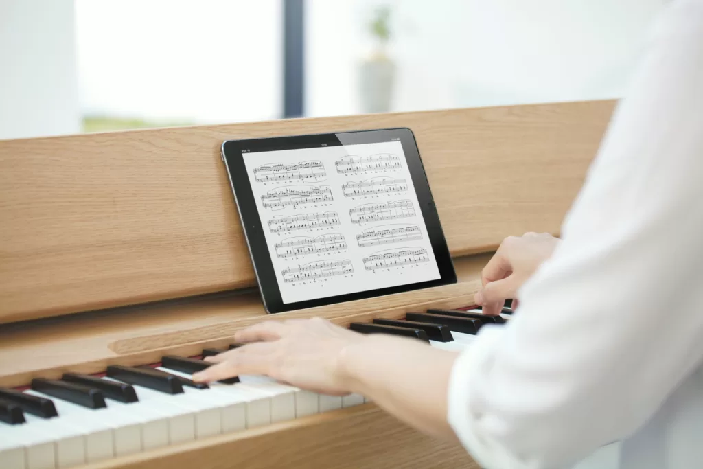 Bluetooth®(オーディオ/MIDI)機能を備え、スマートフォンやタブレットと連携可能。演奏だけでなく、音楽鑑賞やレッスン機能も活用できます。
